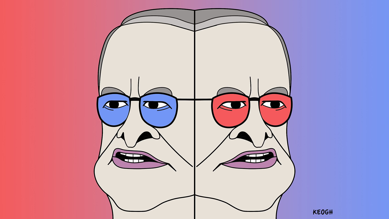 Consider the huge majority Labor now has in the House. I masterminded that. We now occupy the prized centre between traditional Labor and Liberal values. But the blurred zone between red and blue has become vast. Governing in this space means appealing to bluish and reddish constituents, and that takes genius in duplicity. Yes, two-faced Albo is here! But I have to avoid anything radical that might upset traditional, now-disgruntled ex-Liberal voters.