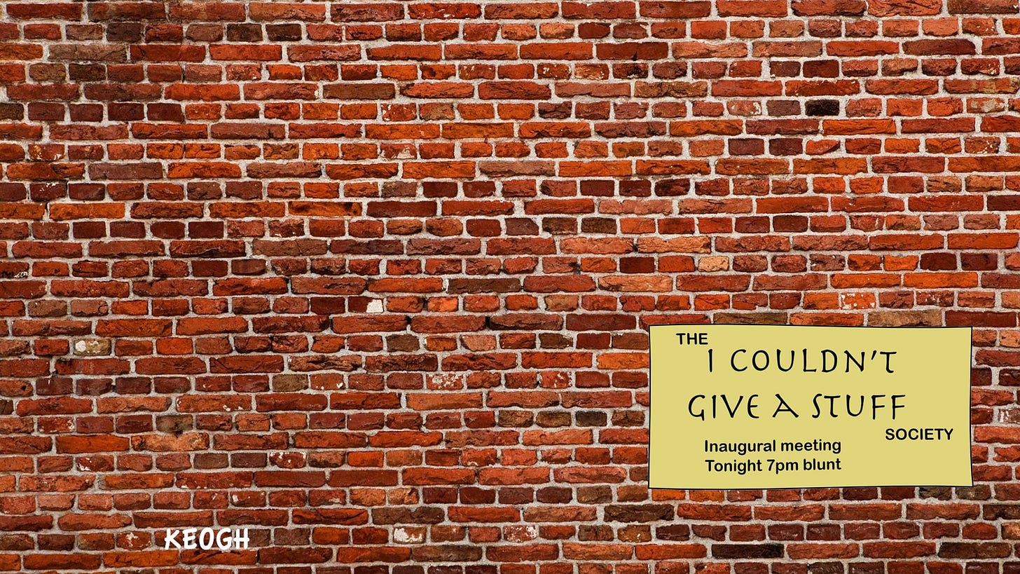 Ladies and gentlemen, welcome to this inaugural meeting of the I Couldn’t Give a Stuff Society, which explains why I am speaking to an empty hall, because nobody could be stuffed turning up, despite my advertising campaign.